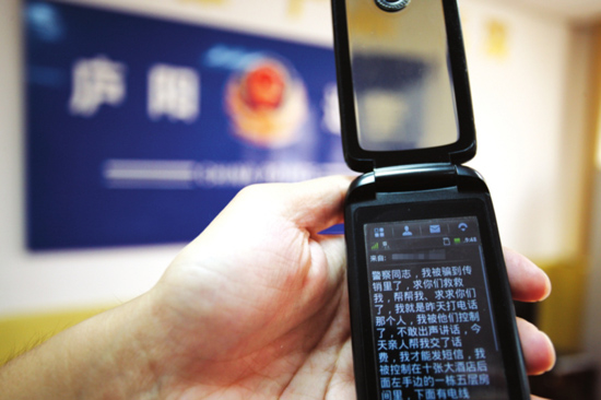 “行动”。在一名误入传销的青年男子发出这条短信后,警方迅速出击,端掉了一个传销团伙。据悉,虽然被贴身“看护”,但这名男子仍偷偷用手机盲打短信,与警方保持联系,并给警方“传信号”,帮助警方端掉了这个传销团伙。目前,该团伙24名传销人员被拘留,其中有一个人还是重点大学毕业的。 110hn.cn