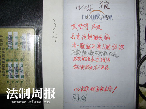很多笔记本在扉页上都会写下一些这样的语句,在传销人员看来,这些都是至理名言,是能带领他们在短期内暴富的“真经秘籍”。一些极具诱惑力和煽动性的话被作为“座右铭”,写在笔记本最醒目的位置。