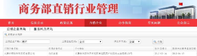而在直销区域中,康婷所报备的6家直销网点包括雨轩美容会馆、秀坤美容美体、兰蔻专业美容、专业祛痘祛斑、磁场CJ和爱黛美疗馆,这6家网点均位于天津,并没有包括肖先生所在福建等地区。